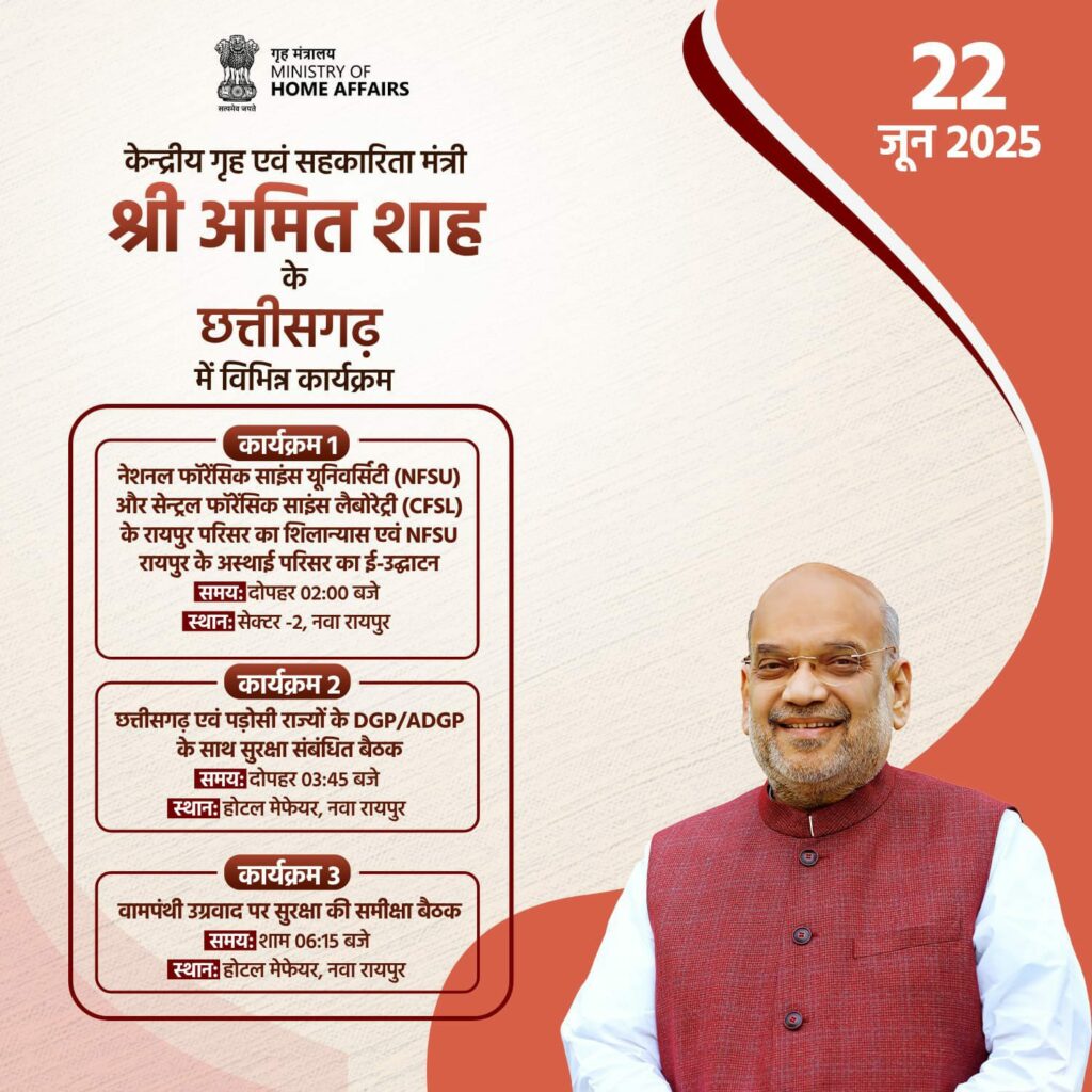 Today News and Updates 22nd June 2025: रायपुर: केंद्रीय गृह मंत्री अमित शाह फिर दो दिवसीय छत्तीसगढ़ दौरे पर आ रहे है। अमित शाह आज 22 जून को दिल्ली से राजधानी रायपुर पहुंचेंग। इसके बाद गृहमंत्री शाह नवा रायपुर के अटल नगर में चल रही केंद्रीय विकास परियोजनाओं का निरीक्षण करेंगे। इसके बाद गृहमंत्री शाह महत्वपूर्ण संस्थानों का उद्घाटन करेंगे और राज्य के सुरक्षा हालात की समीक्षा करते हुए नक्सल उन्मूलन अभियानों को लेकर उच्चस्तरीय बैठक करेंगे।