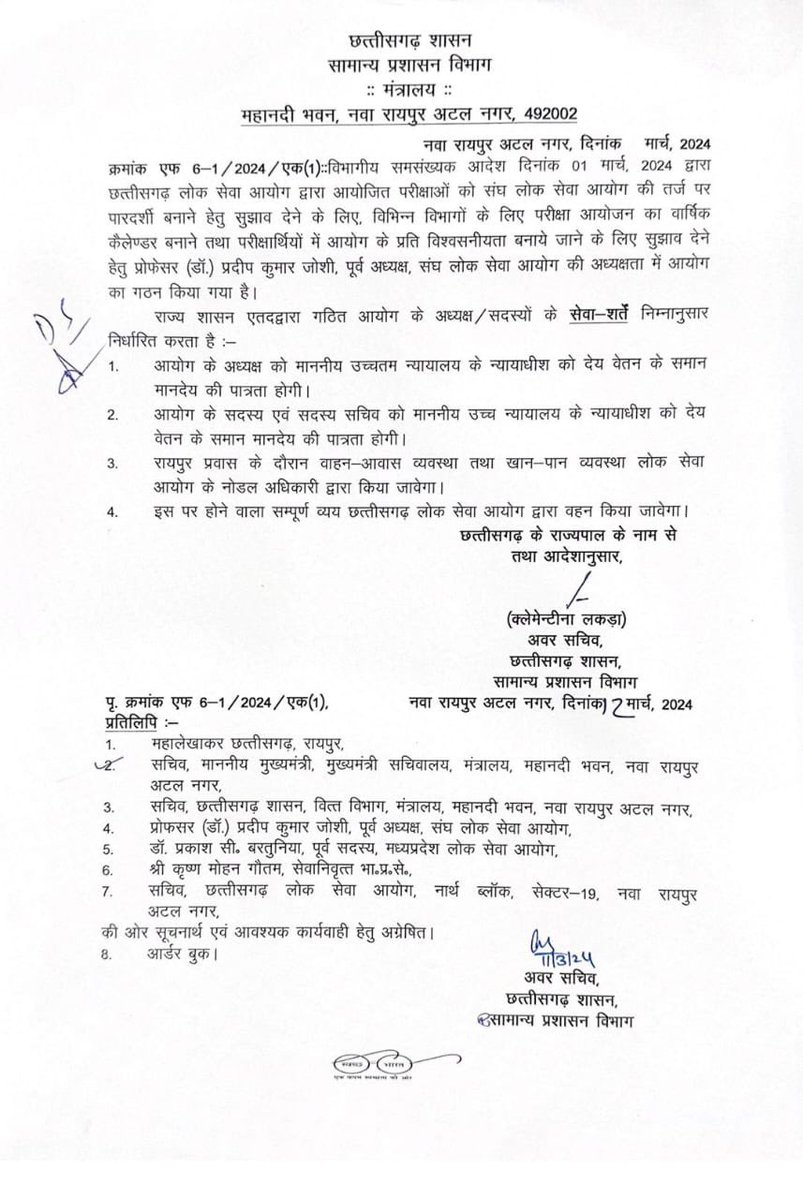 जारी आदेश के अनुसार संघ लोक सेवा आयोग के पूर्व अध्यक्ष प्रोफेसर डॉ. प्रदीप कुमार जोशी की अध्यक्षता में गठित आयोग छत्तीसगढ़ लोक सेवा आयोग द्वारा आयोजित परीक्षाओं को संघ लोक सेवा आयोग की तर्ज पर पारदर्शी बनाने हेतु सुझाव देने के साथ ही विभिन्न विभागों के लिए परीक्षा आयोजन का वार्षिक कैलेण्डर बनाने तथा परीक्षार्थियों में आयोग के प्रति विश्वसनीयता बनाए जाने के लिए भी सुझाव देगी।