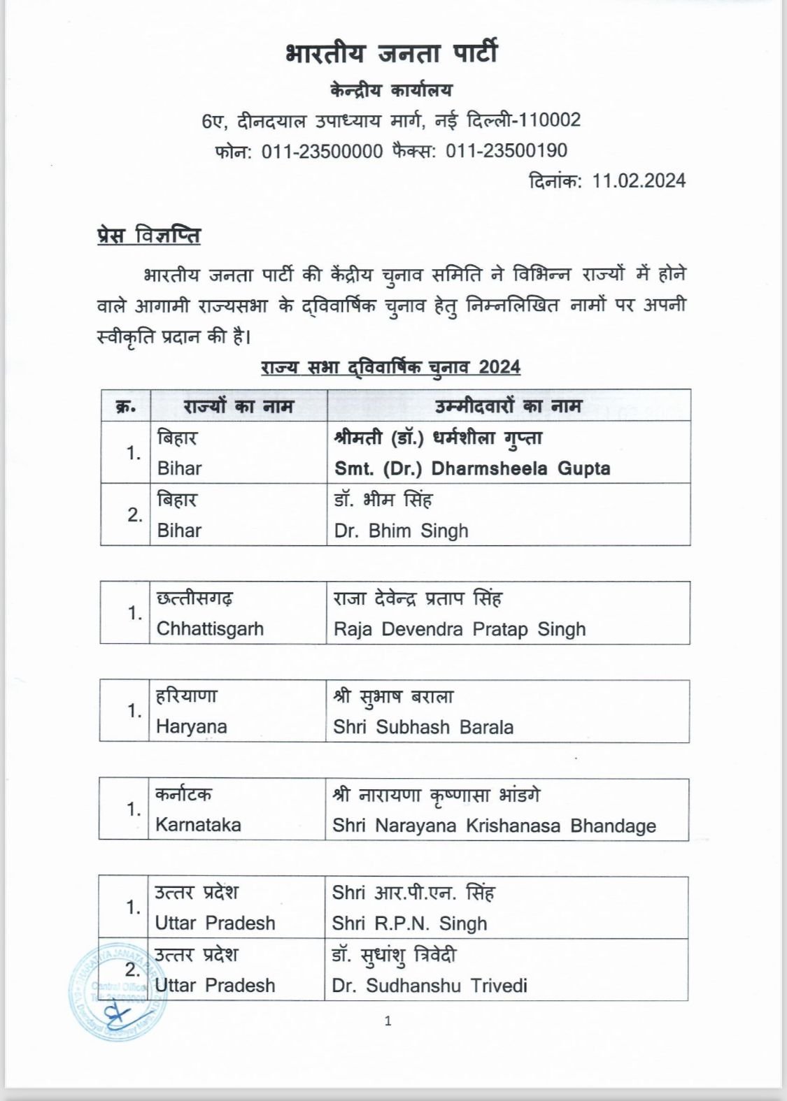भाजपा ने आगामी राज्यसभा चुनावों के लिए बिहार, छत्तीसगढ़, हरियाणा, कर्नाटक, उत्तर प्रदेश, उत्तराखंड और पश्चिम बंगाल से अपने उम्मीदवारों की घोषणा की।