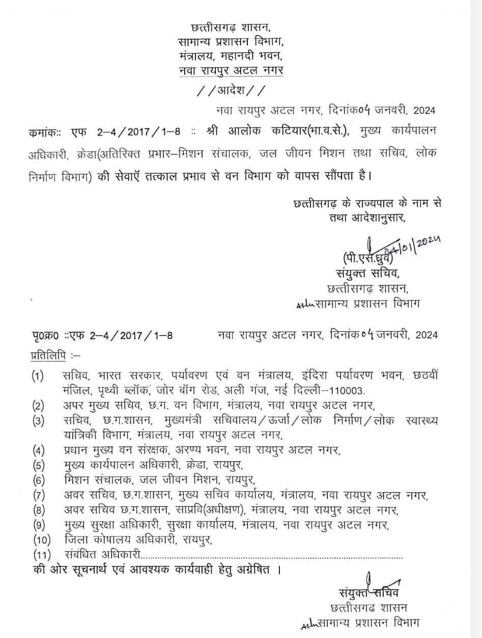 IFS Alok Katiyar removed from CEO Creda: रायुपर। छत्तीसगढ़ में बीते दिन से शुरू हुआ बड़े अधिकारियों के तबादलों और नई जगहों पर नियुक्तियों का दौर अब भी जारी है। इसी बीच बड़ी खबर यह है कि भारतीय वन सेवा के अधिकारी आलोक कटियार को तत्काल प्रभाव से CEO, क्रेडा के पद से हटा दिया गया है। उनकी सेवाएं वन विभाग को वापस सौंप दी गई है। इस आशय के आदेश आज सामान्य प्रशासन विभाग ने जारी किया है।