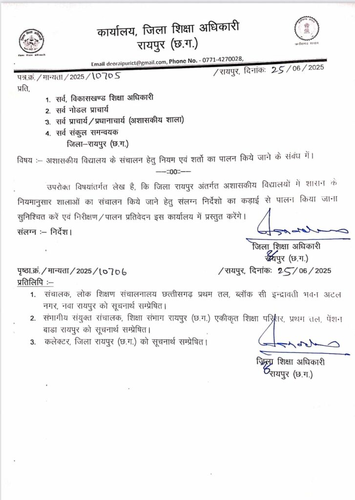 - शिक्षा सत्र के आरंभ में प्रत्येक निजी विद्यालय अपने नोडल प्राचार्य के माध्यम से जिला शिक्षा अधिकारी कार्यालय के प्रमाण-पत्र प्रस्तुत करेंगे कि बिंदु क्रमांक 1 से 7 तक का पालन हमारे संस्था द्वारा किया जा रहा है।
