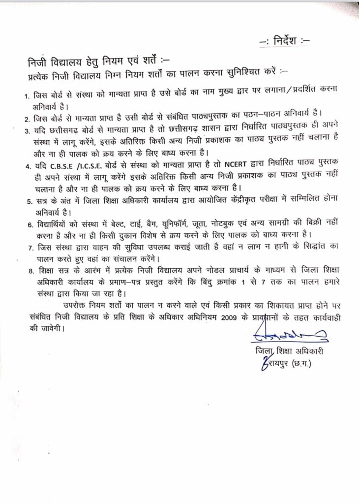- यदि छत्तीसगढ़ बोर्ड से मान्यता प्राप्त है तो छत्तीसगढ़ शासन द्वारा निर्धारित पाठ्यपुस्तक ही अपने संस्था में लागू करेंगे, इसके अतिरिक्त किसी अन्य निजी प्रकाशक का पाठ्य पुस्तक नहीं चलाना है और ना ही पालक को क्रय करने के लिए बाध्य करना है।