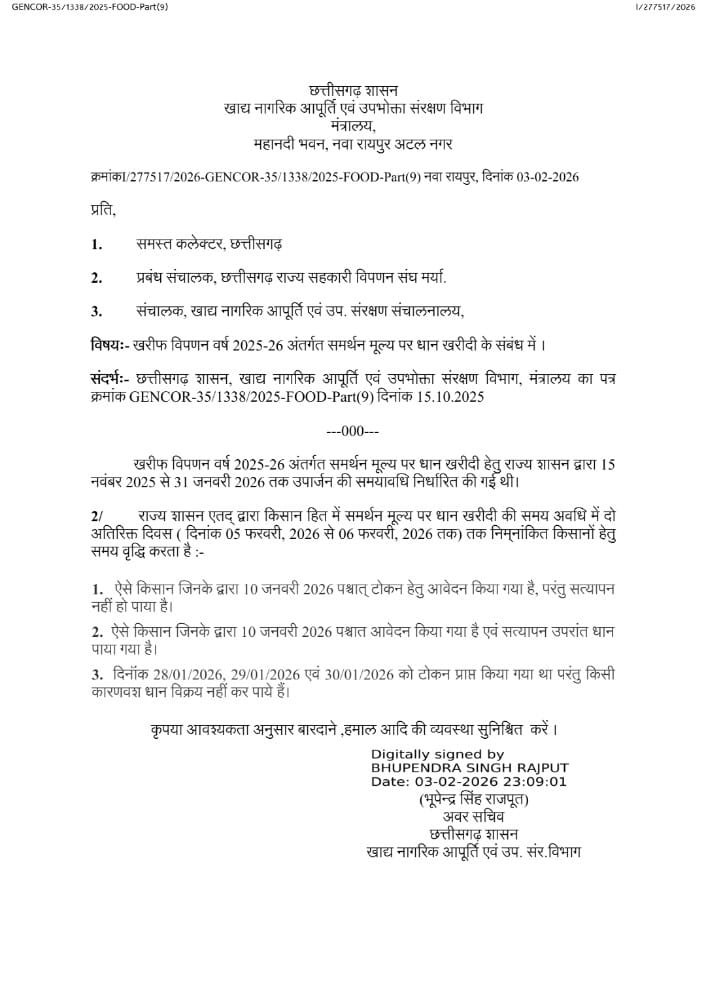 रायपुर: CG Dhan Kharidi Token:  मुख्यमंत्री विष्णुदेव साय के निर्देश पर प्रदेश में किसानों के हितों को सर्वोच्च प्राथमिकता देते हुए धान खरीदी की प्रक्रिया में महत्वपूर्ण राहत प्रदान की गई है। इसके अंतर्गत तीन श्रेणियों के किसानों को धान विक्रय हेतु अतिरिक्त दो दिवस 05 एवं 06 फरवरी 2026 तक खरीदी की अनुमति प्रदान की गई है। छत्तीसगढ़ शासन ने खरीफ विपणन वर्ष 2025-26 के तहत समर्थन मूल्य पर धान खरीदी को लेकर अहम आदेश जारी किया है। खाद्य, नागरिक आपूर्ति एवं उपभोक्ता संरक्षण विभाग मंत्रालय द्वारा जारी पत्र के अनुसार अब किसानों को धान खरीदी के लिए अतिरिक्त समय दिया गया है।
