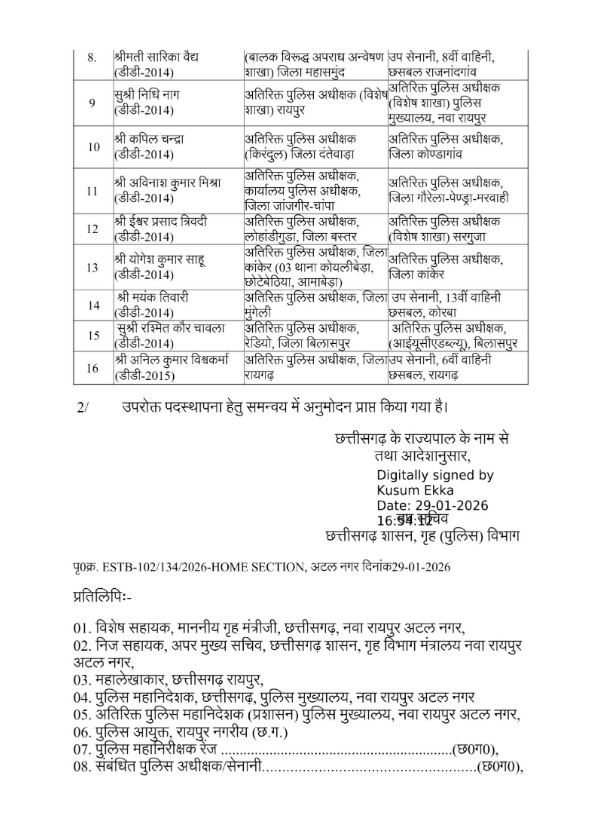 Raipur News: छत्तीसगढ़ में एक बार फिर से राज्य पुलिस सेवा के 16 अफसरों का तबादला हुआ है। (CG Police Transfer) इस फेरबदल में कई जिलों के एएसपी बदले गए हैं। पुलिस विभाग के द्वारा जारी सूची के अनुसार रितेश चौधरी को उपसेनानी 14वीं वाहिनी, छसबल, धनौरा बालोद भेजा गया है। जितेंद्र खूंटे को अतिरिक्त पुलिस अधीक्षक दंतेवाड़ा में भेजा गया है। अंजलि नाग को अतिरिक्त पुलिस अधीक्षक कांकेर, और कर्ण कुमार उके को अतिरिक्त पुलिस अधीक्षक गरियाबंद की जिम्मेदारी सौंपी गई है। पूरी सूची आप नीचे देख सकते हैं।