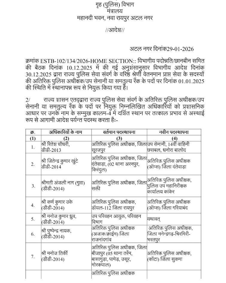 CG Promotion List बता दें कि कि छत्तीसगढ़ सरकार ने बीतें दिनों राज्य पुलिस सेवा के अधिकारियों का तबादला आदेश जारी किया था। गृह विभाग के आदेश के तहत 3 अतिरिक्त पुलिस अधीक्षक (एडिशनल एसपी) और 3 उप पुलिस अधीक्षक (डीएसपी) स्तर के अधिकारियों को नई जिम्मेदारी सौंपी गई थी।अभिषेक कुमार झा को अतिरिक्त पुलिस अधीक्षक (विशेष आसूचना शाखा), कैंप बस्तर से हटाकर अतिरिक्त पुलिस अधीक्षक (ग्रामीण), कार्यालय पुलिस अधीक्षक रायपुर (ग्रामीण) में पदस्थ किया गया है। वहीं प्रशांत शुक्ला, जो अतिरिक्त पुलिस अधीक्षक (यातायात), रायपुर के पद पर कार्यरत थे, उन्हें कार्यालय पुलिस अधीक्षक रायपुर में अतिरिक्त पुलिस अधीक्षक (यातायात) की जिम्मेदारी सौंपी गई है। इसी तरह संदीप मित्तल को अतिरिक्त पुलिस अधीक्षक, क्राइम रायपुर से स्थानांतरित कर अतिरिक्त पुलिस अधीक्षक (क्राइम), कार्यालय पुलिस अधीक्षक रायपुर (ग्रामीण) बनाया गया था।