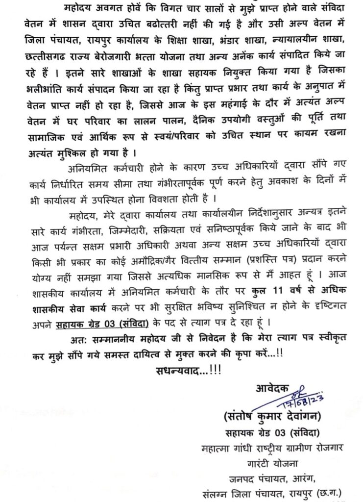 दरअसल त्यागपत्र देने वाला संविदा कर्मचारी संतोष कुमार देवांगन जनपद पंचायत आरंग में मनरेगा विभाग में पदस्थ था। संतोष कुमार के मुताबिक वह पिछले 11 वर्षों से संविदा कर्मचारी (सहायक ग्रेड 3) के तौर पर सेवाएं दे रहा था। संतोष कुमार ने बताया है कि उसे मिलने वाले वेतन और मौजूदा महंगाई के बीच अब परिवार का लालन-पालन मुश्किल होता जा रहा है। बावजूद इसके की वह पूरी ईमानदारी और निष्ठा से अपने कर्त्वयों का निर्वहन करता रहा है। संविदा कर्मी होने के बावजूद उस पर कार्य का भारी दबाव रहता है। वरिष्ठ अधिकारी व कर्मचारियों द्वारा सौंपे गए कार्यो को पूरा करने के लिए उसे अवकाश के दिनों ने भी कार्यालय में उपस्थित रहना पड़ता है। कर्तव्यनिष्ठता से कार्य करने के बावजूद उन्हें कभी एक प्रशस्ति पत्र के लायक भी नहीं समझा गया जिससे वह आहत है, लिहाजा वह अपनी 11 वर्षो की नौकरी से त्यागपत्र दे रहे है।