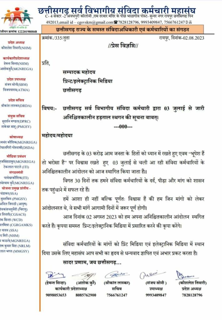उन्होंने आगे बताया है कई विगत 30 दिनों तक हमने संविदा कर्मचारियों के दर्द पीड़ा और मांग को शासन तक पहुंचाने में सफल रहे हैं हमें आशा है हमें आशा ही नहीं बल्कि पूरा विश्वास है कि हम जिन मांगों को लेकर आंदोलनरत थे वे सभी मांगे आगामी दिनों में जरूर पूरी होंगी आज दिनांक 2 अगस्त 2023 को हम अपना अनिश्चितकालीन आंदोलन स्थगित करते हैं।
