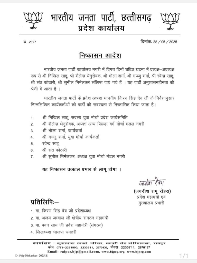 Chhattisgarh Bjp Expelled Order Copy: रायपुर: भारतीय जनता पार्टी छत्तीसगढ़ इकाई ने बड़ा कदम उठाते हुए पार्टी के 7 पदाधिकारी और कार्यकर्ताओं को 6 साल के लिए निष्कासित कर दिया है। इस कार्रवाई की जद में आये नेताओं में युवा मोर्चा प्रदेश कार्य समिति के सदस्य निखिल साहू, नगरी मंडल के पिछड़ा वर्ग मोर्चा के मंडल अध्यक्ष शैलेन्द्र धेनुसेवक, युवा मोर्चा के मंडल अध्यक्ष सुनील निर्मलकर शामिल है। इनके अलावा भोला शर्मा, गज्जू शर्मा, संत कोठारी और रवेंद्र सिंह को भी निष्काषित कर दिया गया है।
