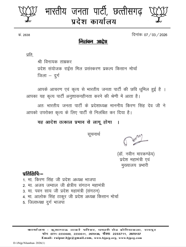 - विनायक ताम्रकार को भाजपा ने पार्टी से निलंबित कर दिया