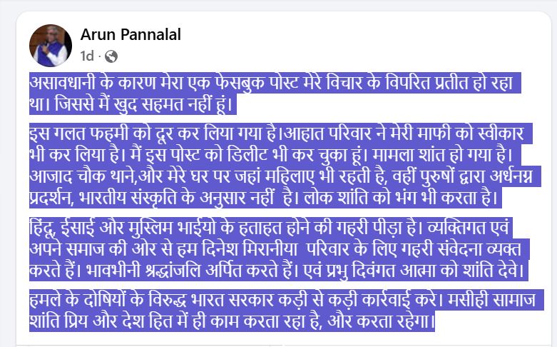अरुण पन्नालाल ने आगे लिखा था, “हिंदू, ईसाई और मुस्लिम भाईयो के हताहत होने की गहरी पीड़ा है। व्यक्तिगत एवं अपने समाज की ओर से हम दिनेश मिरानीया परिवार के लिए गहरी संवेदना व्यक्त करते हैं। भावभीनी श्रद्धांजलि अर्पित करते हैं। एवं प्रभु दिवंगत आत्मा को शांति देवे। हमले के दोषियों के विरुद्ध भारत सरकार कड़ी से कड़ी कार्रवाई करे। मसीही सामाज शांति प्रिय और देश हित में ही काम करता रहा है, और करता रहेगा।”