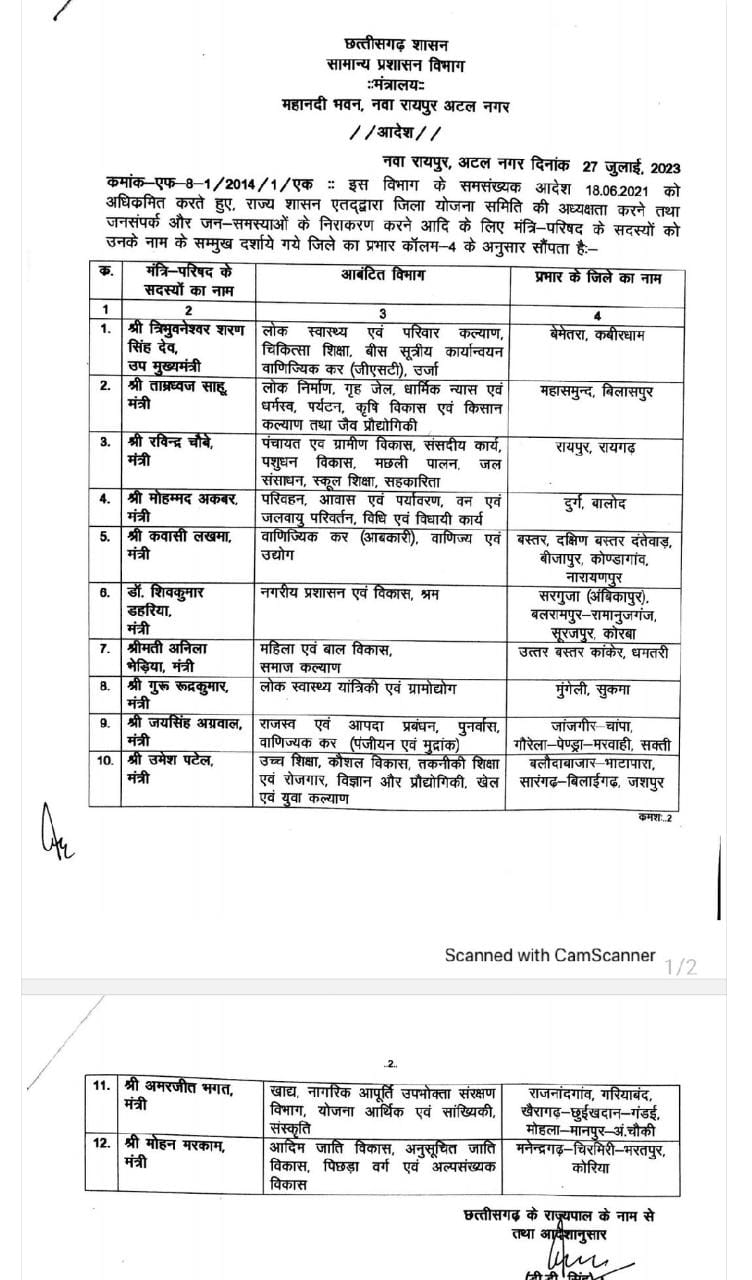 IBC24 News LIVE Update 27 July 2023 : रायपुर: छत्तीसगढ़ में जल्द ही विधानसभा चुनाव होने वाला है। जिसकी तैयारियां शुरु हो गई है। राज्य सरकार ने कैबिनेट मंत्रियों के जिला प्रभार में बदलाव किया है। इस संबंध में सामान्य प्रशासन विभाग ने आदेश भी जारी कर दिया है।