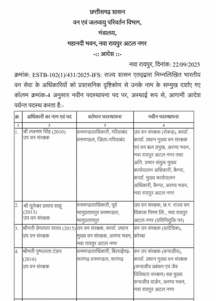 3. प्रेमलता यादव (2015) उप वन संरक्षक, उप वन संरक्षक, कार्य. प्रधान मुख्य वन संरक्षक, अरण्य भवन, नवा रायपुर को वन उप संरक्षक (प्रादेशिक), कोरबा भेजा गया है।