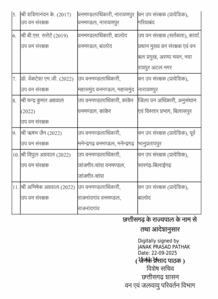 11. अभिषेक अग्रवाल (2022) उप वन संरक्षक, उप वनमण्डलाधिकारी, राजनांदगांव वनमण्डल, राजनांदगांव को वन उप संरक्षक (प्रादेशिक), बालोद भेजा गया है।
