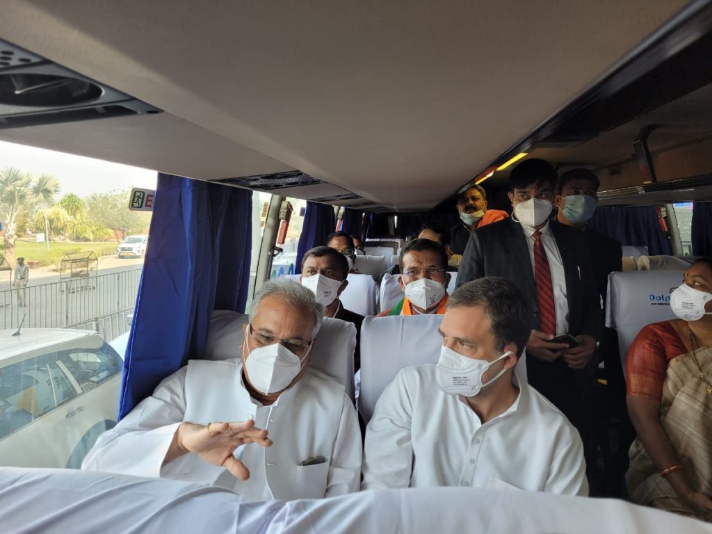 rahul gandhi chhattisgarh : रायपुर, 03 फरवरी 2022। सांसद राहुल गांधी आज एयरपोर्ट से र्साइंस कॉलेज मैदान के कार्यक्रम में मुख्यमंत्री भूपेश बघेल और उनके मंत्रिमंडल के सहयोगियों के साथ बस से पहुंचे। एयरपोर्ट से साईंस कॉलेज मैदान तक की यात्रा के दौरान मुख्यमंत्री भूपेश बघेल ने सांसद राहुल गांधी को छत्तीसगढ़ सरकार की विभिन्न जनकल्याण योजनाओं की जानकारी दी। इस दौरान सांसद राहुल गांधी ने गोबर खरीदी, गोबर से बिजली बनाने की योजना तथा धान खरीदी व्यवस्था की प्रशंसा की।