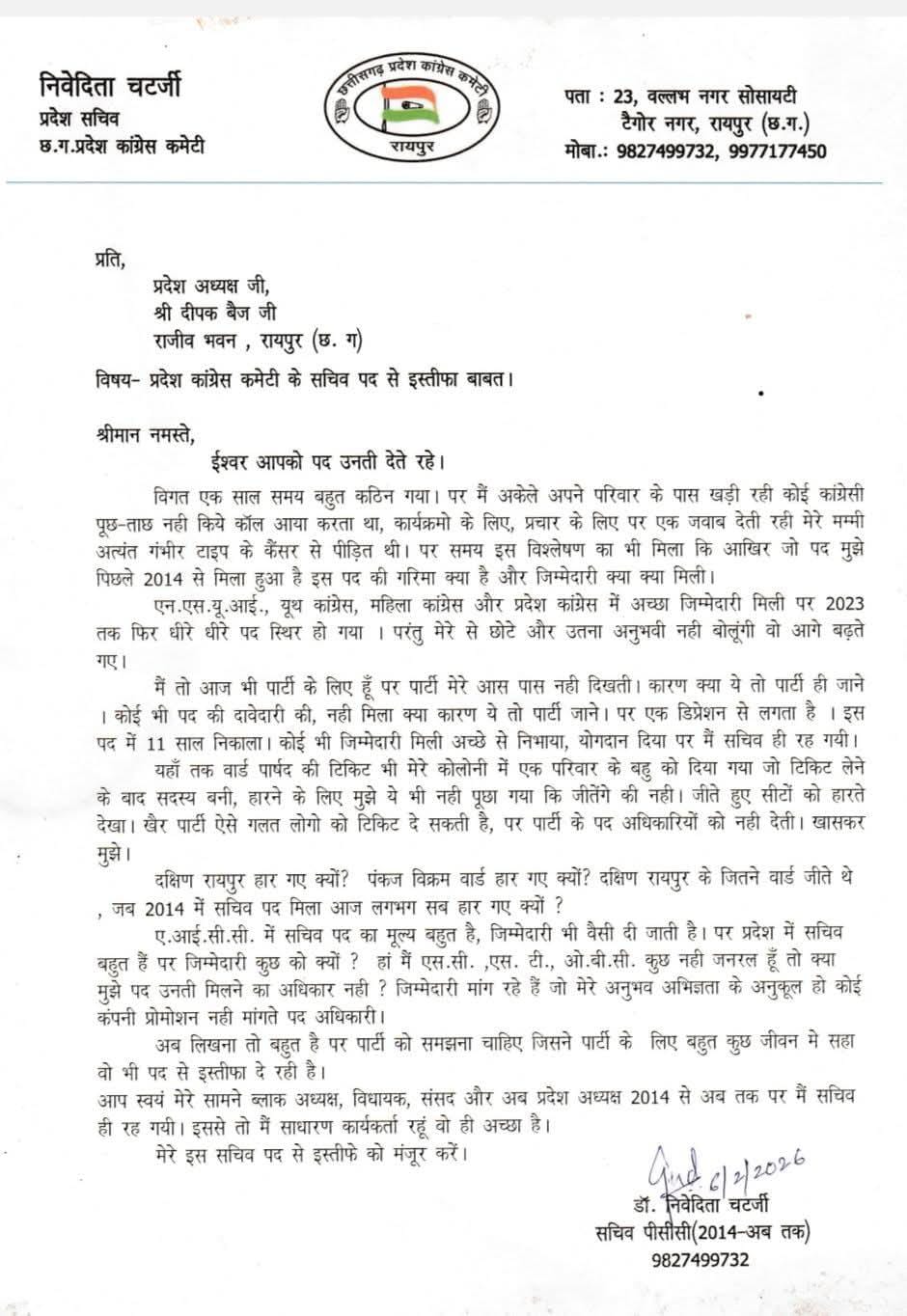 इस्तीफे में निवेदिता चटर्जी ने संगठन में लंबे समय से उपेक्षा और जिम्मेदारी न मिलने का आरोप लगाया है। उन्होंने पत्र में लिखा है कि पिछले 11 वर्षों से वे पार्टी के लिए लगातार कार्य कर रही हैं, लेकिन इसके बावजूद उन्हें कोई ठोस जिम्मेदारी या अवसर नहीं दिया गया। निवेदिता चटर्जी ने अपने इस्तीफे में लिखा कि वह वर्ष 2014 से लगातार PCC सचिव के पद पर बनी रहीं, जबकि उनके सामने कई नेता ब्लॉक अध्यक्ष, विधायक और सांसद बने और बाद में प्रदेश अध्यक्ष जैसे बड़े पदों तक पहुंचे। उन्होंने लिखा कि मेरे सामने दीपक बैज ब्लॉक अध्यक्ष बने, विधायक बने, सांसद बने और अंततः प्रदेश अध्यक्ष भी बने, लेकिन मैं 2014 से आज तक सचिव ही रह गई।