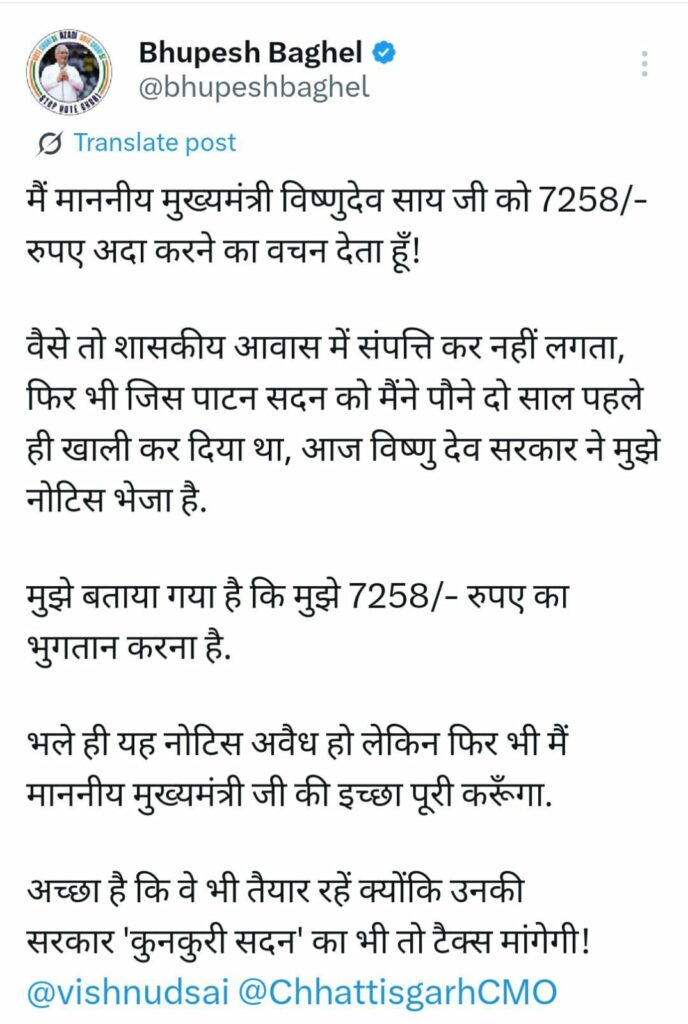 भूपेश बघेल ने ट्वीट कर कहा है कि मुझे संपत्ति कर भेजा गया है, जिसे मैंने पटा भी दिया है।