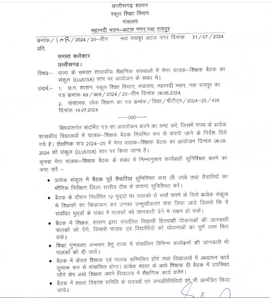 रायपुर। Parent teacher meet in chhattsigarh govt school छत्तीसगढ़ प्रदेश के सभी शासकीय स्कूलों में पैरेंट्स टीचर मीट का आयोजन किया जाएगा। स्कूल शिक्षा विभाग ने इसका आदेश जारी किया है। सभी जिले के कलेक्टरों को तैयारी के निर्देश जारी कर दिए गए हैं। आगामी 6 अगस्त को क्लस्टर स्तर पर पैरेंट्स टीचर मीट होगी। शिक्षा विभाग द्वारा 12 पॉइंट्स पर पैरेंट्स से फीडबैक लेने के निर्देश दिए गए हैं।