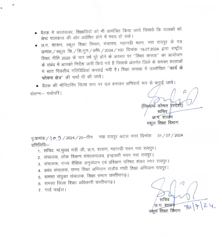 स्कूल शिक्षा सचिव की तरफ से जारी पत्र में स्पष्ट रूप से कहा गया है कि, प्रत्येक संकुल में बैठक पूर्व तैयारियां सुनिश्चित करा ली जाये तथा तैयारियों का भौतिक निरीक्षण जिला स्तरीय टीम से कराना सुनिश्चित करें। बैठक के दौरान निर्धारित 12 मुद्दों पर पालको से चर्चा करने के लिये प्रत्येक संकुल में शिक्षकों का चिन्हांकन कर उनका उन्मुखीकरण करा लिया जाये जिससे कि वे संबंधित मुद्दों के संबंध में पालकों को जानकारी देने में सक्षम हो सकें। बैठक में शिक्षक, शासन द्वारा संचालित विद्यार्थी हितग्राही योजनाओं की जानकारी पालकों को देंगे, जिससे पालक एवं विद्यार्थियों को योजनाओं का पूर्ण लाभ मिल सके। शिक्षा गुणवत्ता उन्नयन हेतु राज्य में संचालित विभिन्न कार्यकमों की जानकारी भी पालकों को दी जावें।