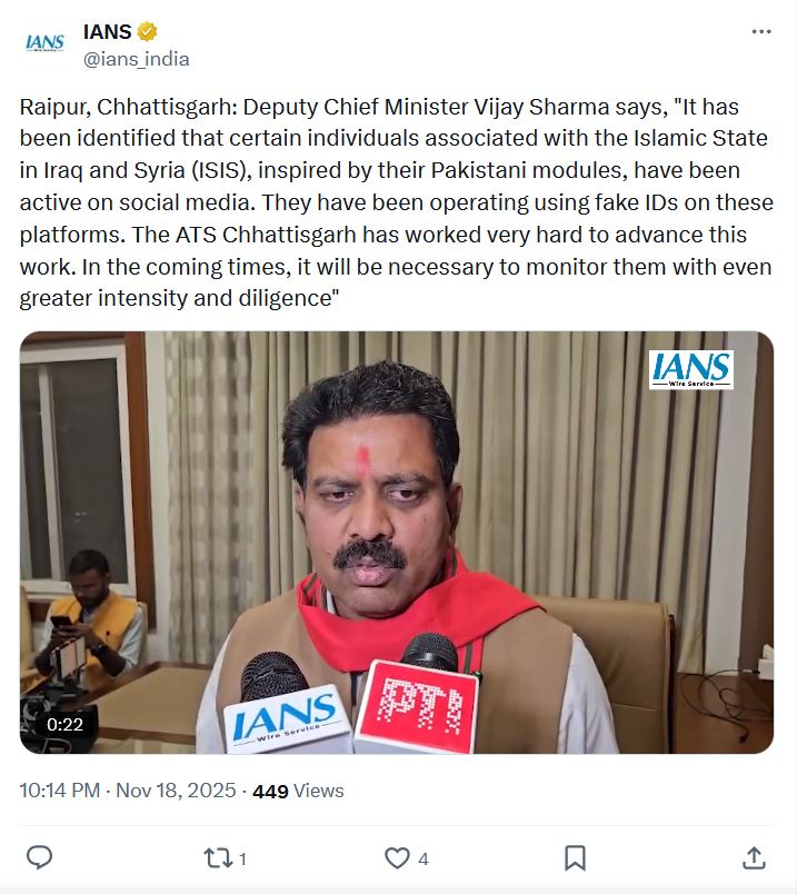ISIS Module Cracked in Raipur: इस बारें में उपमुख्यमंत्री विजय शर्मा ने कहा, “यह पता चला है कि इस्लामिक स्टेट इन इराक एंड सीरिया (आईएसआईएस) से जुड़े कुछ लोग, अपने पाकिस्तानी मॉड्यूल से प्रेरित होकर, सोशल मीडिया पर सक्रिय हैं। वे इन प्लेटफॉर्म पर फर्जी आईडी का इस्तेमाल कर काम कर रहे हैं। एटीएस छत्तीसगढ़ ने इस काम को आगे बढ़ाने के लिए बहुत मेहनत की है। आने वाले समय में इन पर और भी अधिक गहनता और तत्परता से नज़र रखना ज़रूरी होगा।”