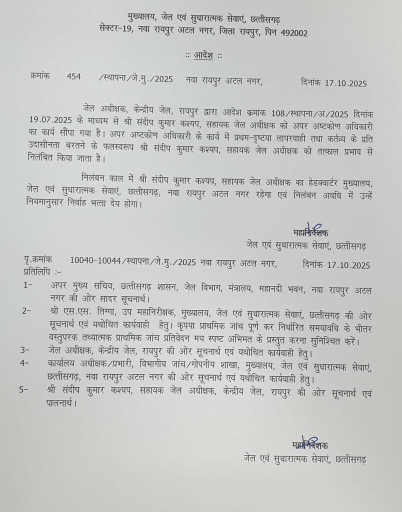 Raipur Centrel Jail News: रायपुर: जिले के जेल विभाग से बड़ी खबर सामने है। जेल महानिदेशक कार्यालय ने रायपुर सेन्ट्रल जेल के सहायक जेल अधीक्षक संदीप कुमार कश्यप को सस्पेंड कर दिया गया है। निलंबन काल में संदीप कुमार की तैनाती मुख्यालय रायपुर में तय की गई है। सहायक जेल सुपरिटेंडेंट पर हुई इस कार्रवाई के बाद रायपुर केंद्रीय जेल प्रबंधन में हड़कंप मचा हुआ है।