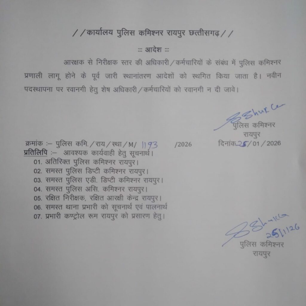 इस बीच रायपुर पुलिस आयुक्त डॉ संजीव शुक्ला ने कमिश्नरी के तहत आने वाले थाना क्षेत्रों को लेकर एक अहम आदेश जारी किया है। उन्होंने आयुक्त प्रणाली लागू होने से ठीक पहले जारी किये गये पुलिस के अफसरों और कर्मचारियों के ट्रांसफर आदेश पर रोक लगा दी है। इस संबंध में जारी आदेश के तहत कहा गया है कि, “आरक्षक से निरीक्षक स्तर की अधिकारी/कर्मचारियों के संबंध में पुलिस कमिश्नर प्रणाली लागू होने के पूर्व जारी स्थानांतरण आदेशों को स्थगित किया जाता है। नवीन पदस्थापना पर रवानगी हेतु शेष अधिकारी/कर्मचारियों को रवानगी न दी जावे।”