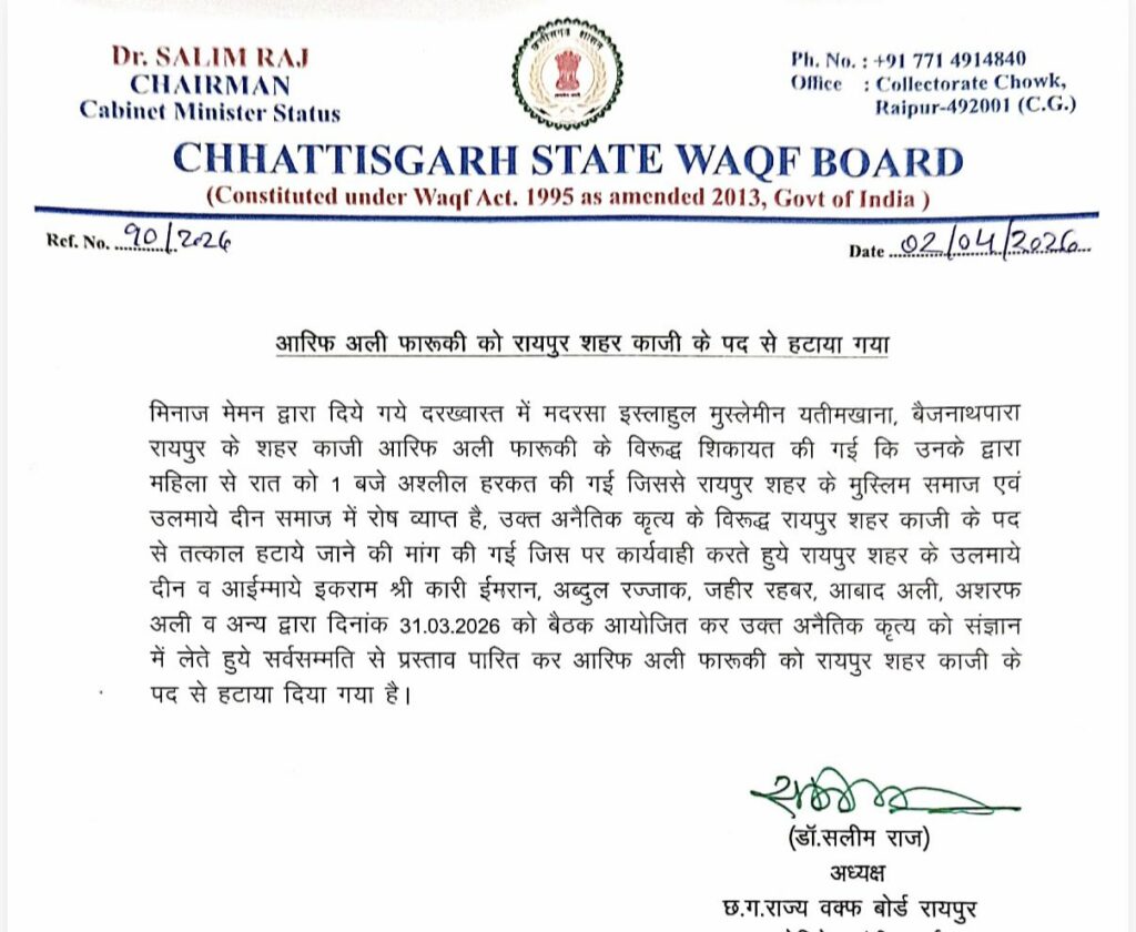 इस बारें में वक़्फ़ बोर्ड द्वारा लिखित आदेश भी जारी किया गया है। इसमें लिखा गया है कि, “एक दरख्वास्त में मदरसा इस्लाहुल मुस्लिमीन यतीमखाना, बैजनाथपारा रायपुर के शहर काजी आरिफ अली फारूकी के विरुद्ध शिकायत की गई कि उनके द्वारा महिला से रात को 1 बजे अश्लील हरकत की गई है जिससे रायपुर शहर के मुस्लिम समाज एवं उलेमा दीन समाज में रोष व्याप्त है। (Raipur Qazi Arif Farooqui Dismissed) उक्त अनैतिक कृत्य के विरुद्ध रायपुर शहर काजी के पद से तत्काल हटाये जाने की मांग की गई जिस पर कार्यवाही करते हुए रायपुर शहर के उलेमा दीन व आइम्माये इकराम श्री कारी ईमरान, अब्दुल रज्जाक, जहीर रहबर, आबाद अली, अशरफ अली व अन्य द्वारा दिनांक 31.03.2026 को बैठक आयोजित कर उक्त अनैतिक कृत्य को संज्ञान में लेते हुए सर्वसम्मति से प्रस्ताव पारित कर आरिफ अली फारूकी को रायपुर शहर काजी के पद से हटाया दिया गया है।”