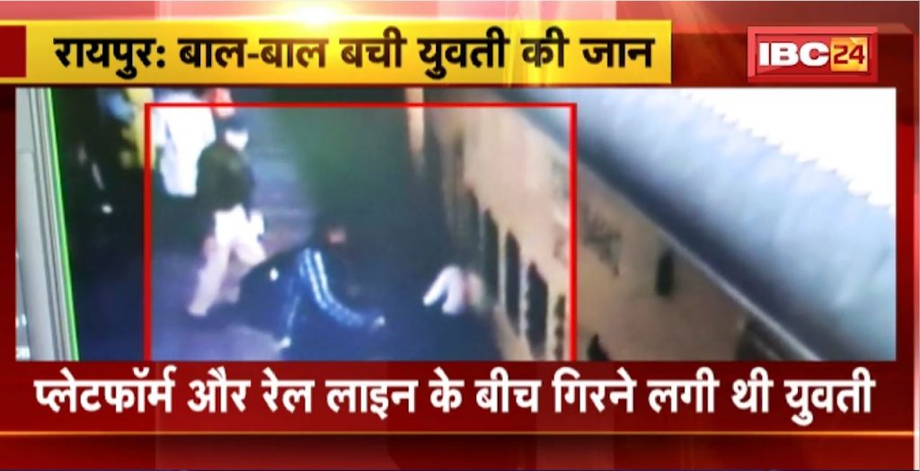 Raipur Railway Station News : चलती ट्रेन में चढ़ने के दौरान युवती का फिसला पैर। बाल-बाल बची युवती की जान