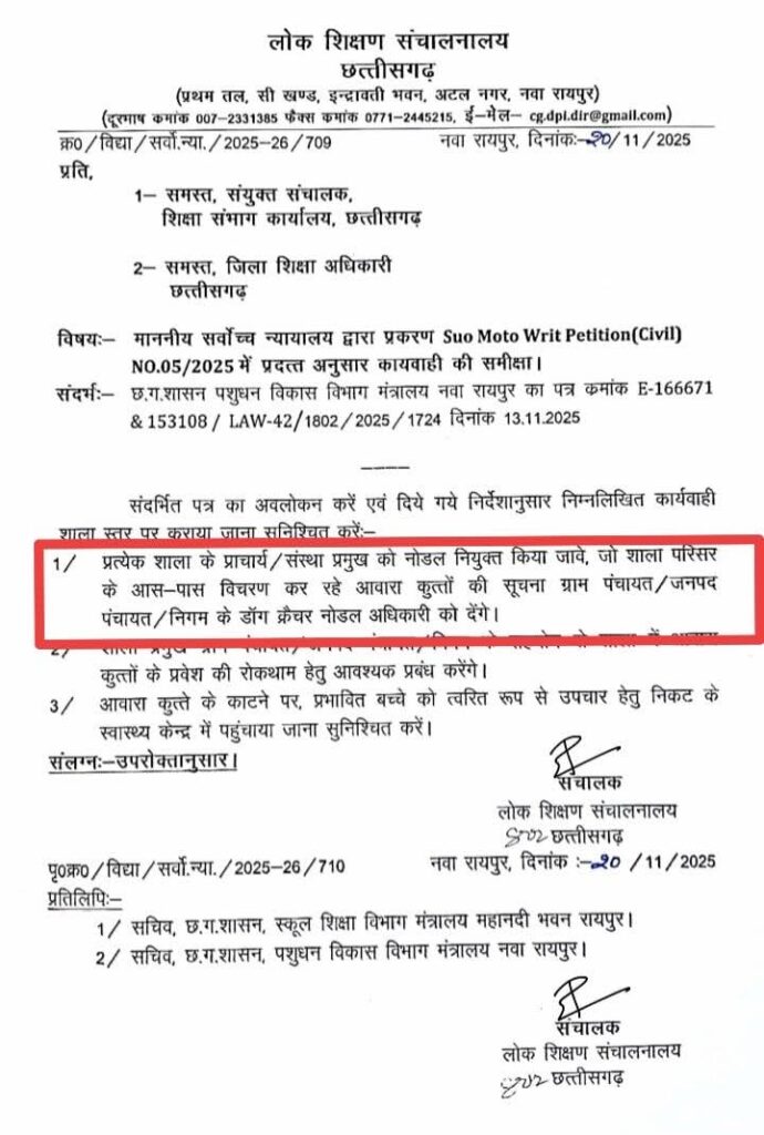 बता दें कि प्रदेश में स्कूलों के पास आवारा कुत्तों की जानकारी देने के लिए अब शिक्षकों की तैनाती की गई है। इस संबंध में छत्तीसगढ़ लोक शिक्षण संचालनालय ने सभी DEO को आदेश जारी किया है। जिसके तहत स्कूल के संस्था प्रमुखों को नोडल अधिकारी बनाया गया है। साथ ही जारी आदेश में स्कूल परिसर के आसपास घूम रहे आवारा कुत्तों का सूचना पंचायत व जनपद पंचायत, निगम के डाॅग कैचर को देने को कहा है। इस संबंध में लोक शिक्षण संचालनालाय ने सभी DEO को पत्र भेजा है।