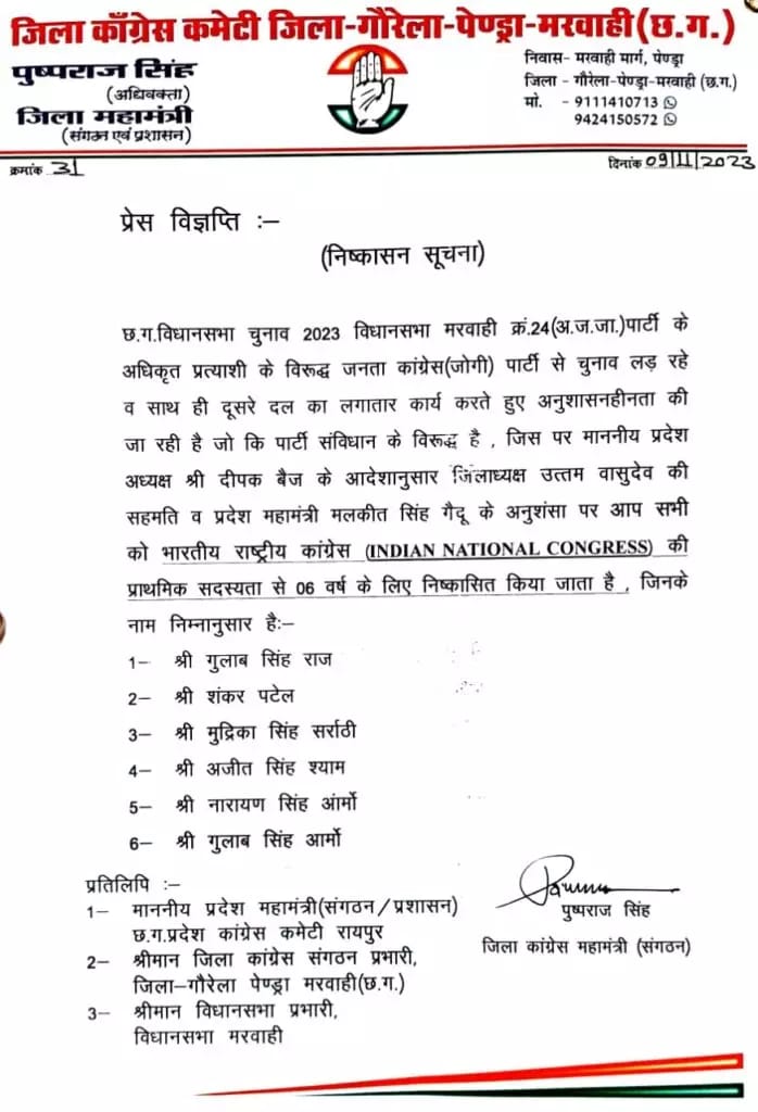 गौरेला पेंड्रा मरवाही जिले में कांग्रेस से बगावत करने वाले 6 कांग्रेसी नेता निष्कासित किए गए हैं, जिनमे कांग्रेस से अलग होकर जेसीसीजे पार्टी के मरवाही प्रत्याशी गुलाब राज सहित 6 लोग कांग्रेस पार्टी से निष्कासित हुए हैं। जिला कांग्रेस की ओर से विज्ञप्ति जारी कर बताया गया है कि गुलाब राज, सरपंच संघ अध्यक्ष अजीत श्याम, वरिष्ठ कांग्रेसी नेता शंकर पटेल, गौरेला ब्लॉक कांग्रेस कार्यकारी अध्यक्ष मुद्रिका सर्राटी सहित नारायण आर्मो और गुलाब सिंह को कांग्रेस पार्टी अनुशासनहीनता के कारण 6 वर्ष के लिए निष्कासित कर दिया है।