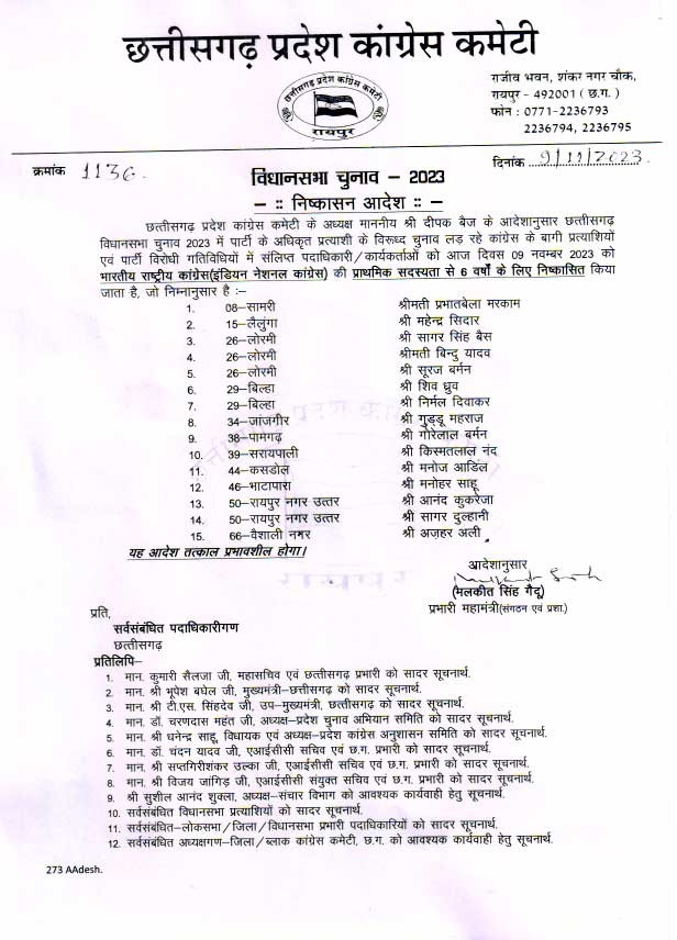 action against 6 Congress leaders: लोरमी से सागर बैज, पामगढ़ से गोरेलाल बर्मन निष्कासित किए गए हैं, सरायपाली किस्मतलाल नंद, बिल्हा से गुड्डू महराज निष्कासित किए गए हैं, वहीं रायपुर उत्तर से आनंद कुकरेजा निष्कासित किए हैं।