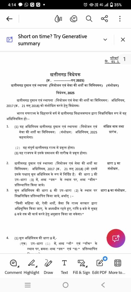 - छत्तीसगढ़ दुकान एवं स्थापना संशोधन विधेयक विधानसभा से पारित