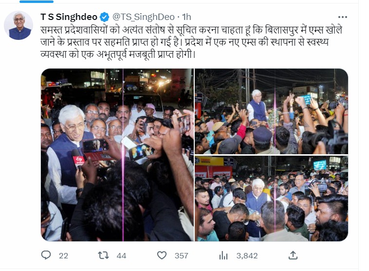 बिलासपुर : Second Aiims In Chhattisgarh : काफी दिनों से ये खबर सामने आ रही थी की छत्तीसगढ़ में एक और एम्स खोला जाएगा। वहीं अब इस बात पर मुहर लगती नजर आ रही है। बिलासपुर में छत्तीसगढ़ का दूसरा एम्स खुलने वाला है। बिलासपुर में एम्स खोले जाने को लेकर सहमति मिल गयी है। प्रदेश के स्वास्थ्य मंत्री टीएस सिंहदेव ने ट्वीट कर इस बात की जानकारी दी है।