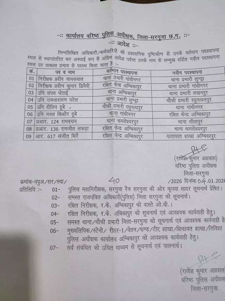 छत्तीसगढ़ में बदले गए कई थानों के टीआई, Surguja Police Transfer List: Several Police Stations TIs Transferred