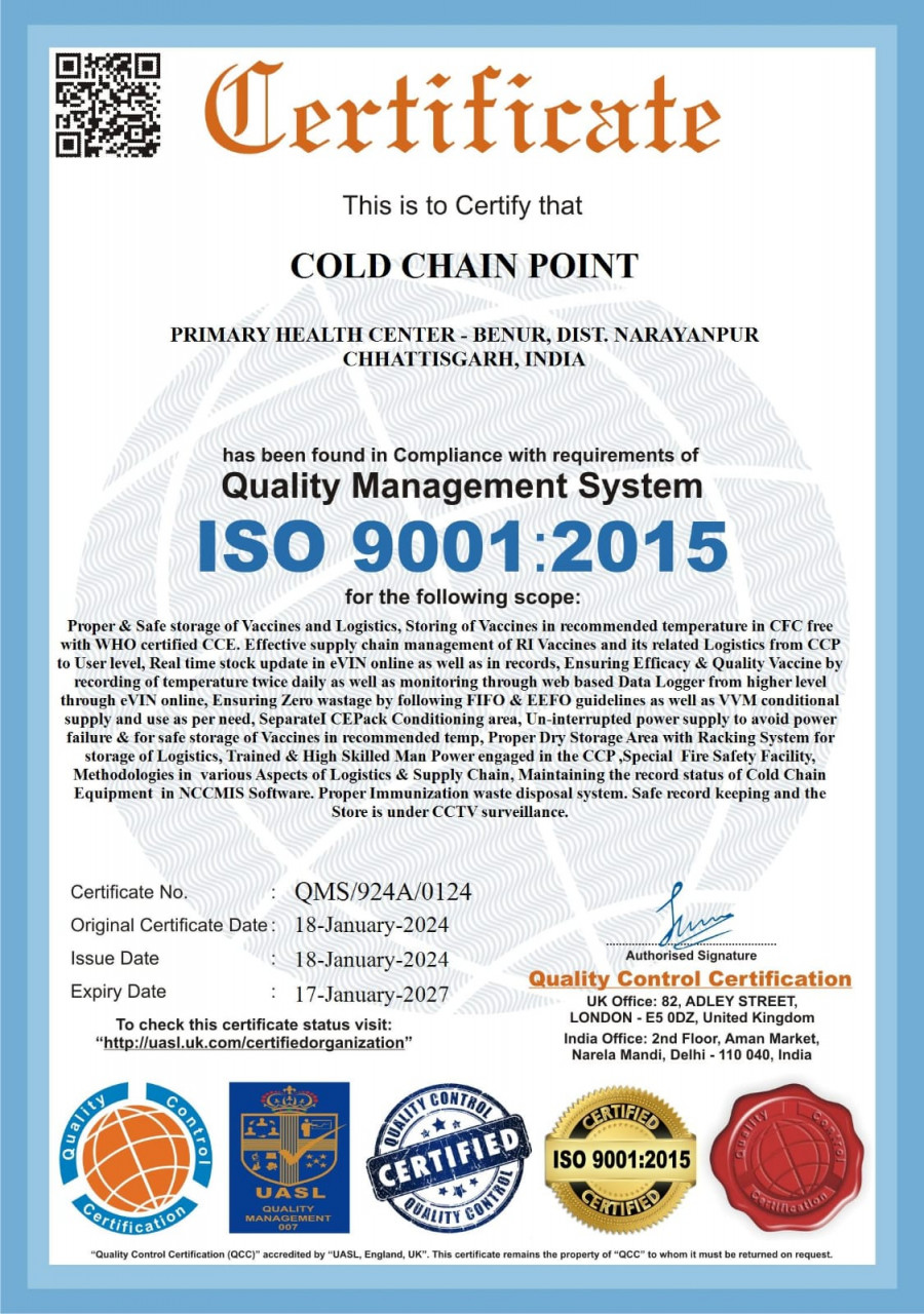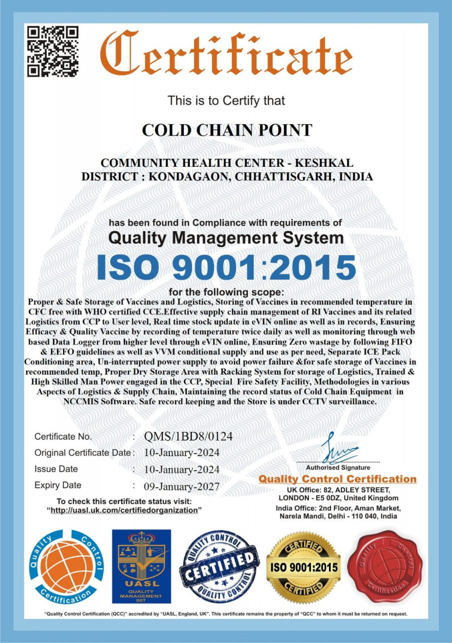 ISO Certificate to 3 Hospitals of CG : कांकेर, कोंडागांव और नारायणुपर जिले के इन शासकीय अस्पतालों के कोल्ड चैन पॉइंट्स में अंतर्राष्ट्रीय मानकीकरण संगठन द्वारा वैक्सीन एवं लॉजिस्टिक के उचित, सुरक्षित एवं अनुशंसित तापमान में वैक्सीन के भंडारण आदि की समीक्षा के बाद आईएसओ सर्टिफिकेट जारी किया गया है। स्वास्थ्य विभाग के अधिकारियों ने बताया कि यूएनडीपी के तकनीकी सहयोग से सामुदायिक स्वास्थ्य केन्द्र नरहरपुर और केशकाल एवं प्राथमिक स्वास्थ्य केंद्र बेनूर में वैक्सीन के रख-रखाव, भण्डारण आदि की व्यवस्था की जा रही थी। आईएसओ टीम द्वारा इन अस्पतालों में वैक्सीन और उससे संबंधित लॉजिस्टिक का प्रभावी आपूर्ति श्रृंखला प्रबंधन और वास्तविक समय में स्टॉक अपडेट ऑनलाइन के साथ-साथ रिकॉर्ड की भी की जांच की गई।