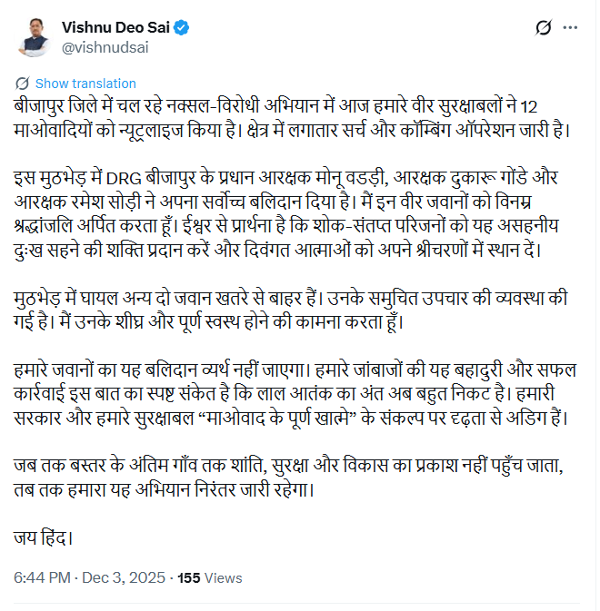 रायपुरः Police-Naxalite Encounter: बीजापुर जिले में आज चल रहे नक्सल-विरोधी अभियान में सुरक्षाबलों को बड़ी सफलता प्राप्त हुई है। संयुक्त सर्च एवं कॉम्बिंग ऑपरेशन के दौरान सुरक्षाबलों ने 12 माओवादियों को न्यूट्रलाइज किया है। क्षेत्र में अभी भी सर्च अभियान सतत जारी है।मुख्यमंत्री विष्णु देव साय ने इस अभियान के दौरान वीरगति को प्राप्त हुए डीआरजी बीजापुर के प्रधान आरक्षक मोनू वडड़ी, आरक्षक दुकारू गोंडे और आरक्षक रमेश सोड़ी को श्रद्धांजलि अर्पित की है। उन्होंने ईश्वर से प्रार्थना की कि शोक-संतप्त परिवारों को इस असहनीय पीड़ा को सहने की शक्ति प्रदान करें और दिवंगत आत्माओं को अपने चरणों में स्थान दें। मुख्यमंत्री ने कहा कि इस मुठभेड़ में घायल दो अन्य जवान खतरे से बाहर हैं और उनके समुचित उपचार की संपूर्ण व्यवस्था की गई है। उन्होंने दोनों जवानों के शीघ्र एवं पूर्ण स्वास्थ्य लाभ की कामना की।