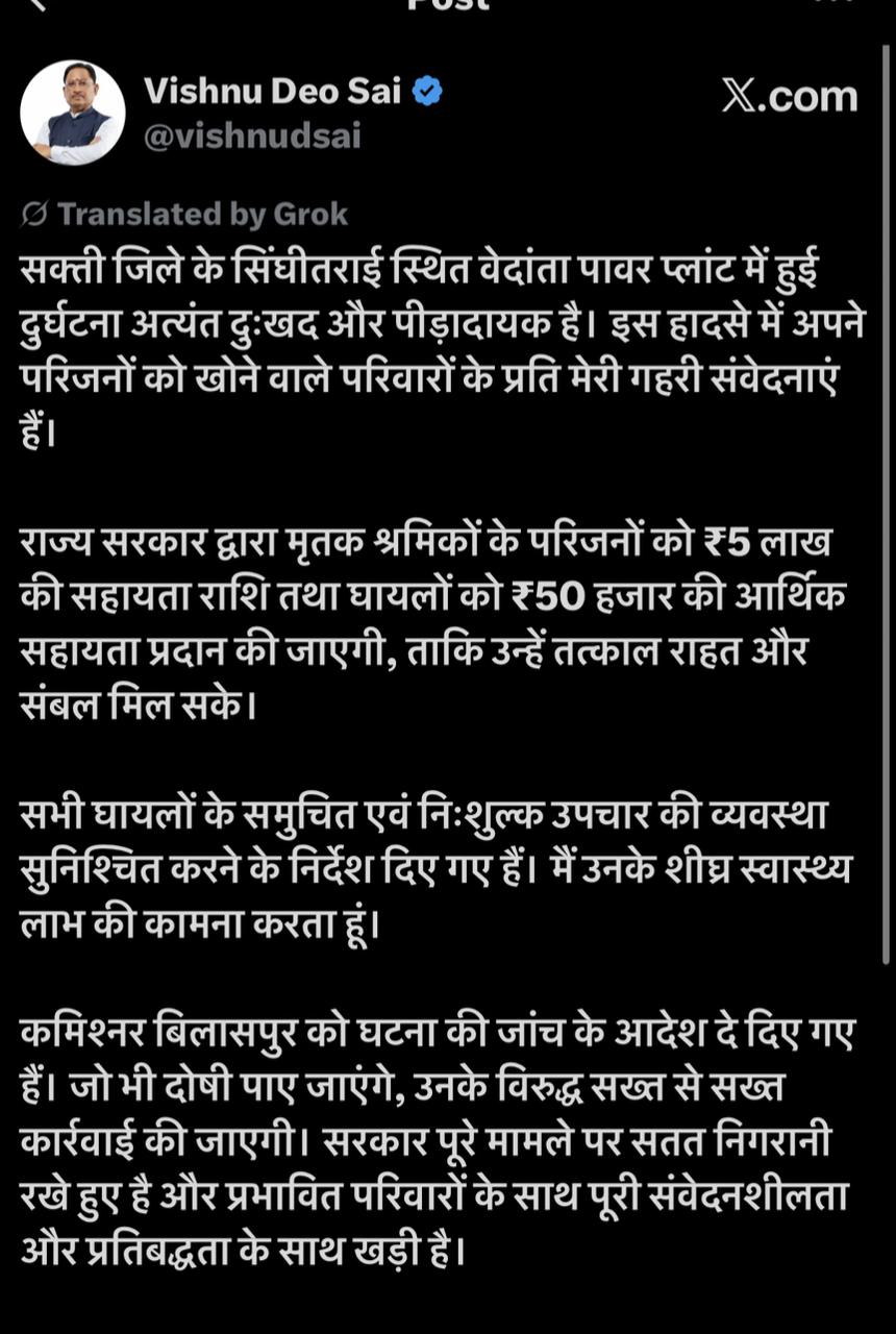 Vedanta Power Plant Latest News मुख्यमंत्री साय ने कहा कि इस कठिन समय में राज्य सरकार प्रभावित परिवारों के साथ पूरी संवेदनशीलता और प्रतिबद्धता के साथ खड़ी है। उन्होंने मृतक श्रमिकों के परिजनों को 5-5 लाख रुपए की सहायता राशि प्रदान करने की घोषणा की है। साथ ही, हादसे में घायल हुए श्रमिकों को 50-50 हजार रुपए की आर्थिक सहायता दी जाएगी, ताकि उन्हें तत्काल राहत और संबल मिल सके। मुख्यमंत्री ने अधिकारियों को निर्देश दिए हैं कि सभी घायलों के समुचित एवं निःशुल्क उपचार की व्यवस्था सुनिश्चित की जाए। उन्होंने घायलों के शीघ्र स्वास्थ्य लाभ की कामना करते हुए कहा कि इलाज में किसी भी प्रकार की लापरवाही बर्दाश्त नहीं की जाएगी।