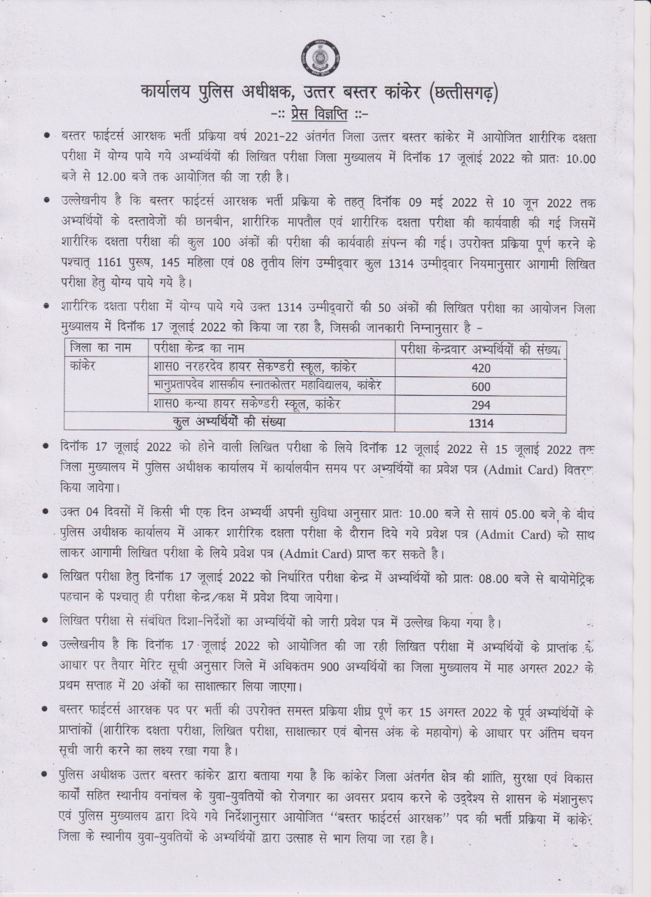 बस्तर फाइटर आरक्षक भर्ती के लिए लिखित परीक्षा 17 जुलाई को, कांकेर जिले में बनाए गए 3 सेंटर, अभ्यर्थियों को ऐसे मिलेगा प्रवेश पत्र