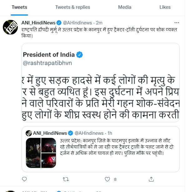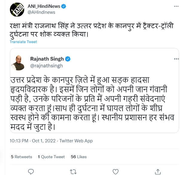 वहीं रक्षा मंत्री राजनाथ सिंह ने उत्तर प्रदेश के कानपुर में ट्रैक्टर-ट्रॉली दुर्घटना पर शोक व्यक्त किया।