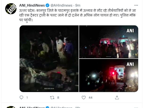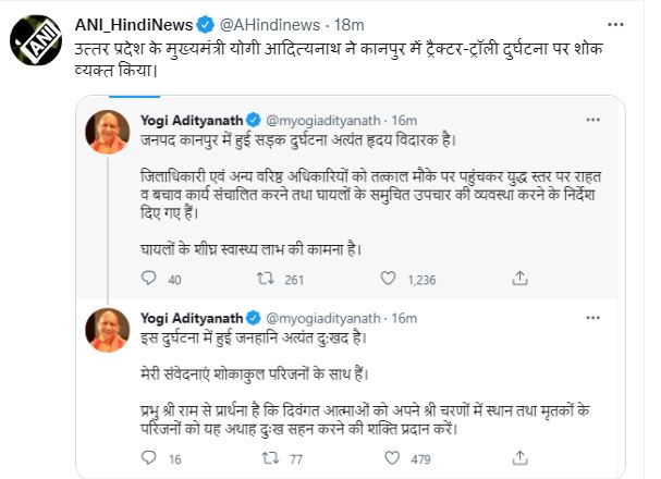 उत्तर प्रदेश के मुख्यमंत्री योगी आदित्यनाथ ने कानपुर में ट्रैक्टर-ट्रॉली दुर्घटना पर शोक व्यक्त किया। https://t.co/pg2oBEWJZV pic.twitter.com/cABCHREJfF