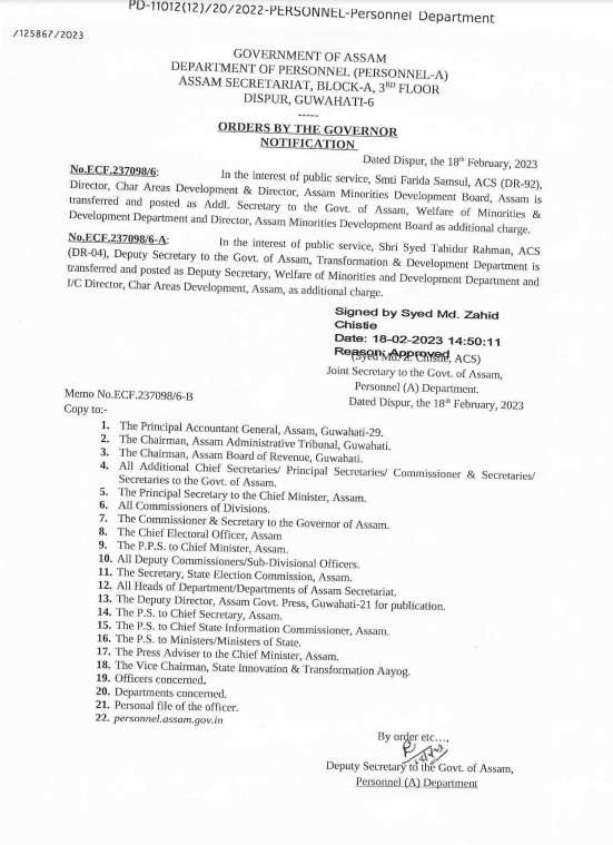 Assam Administrative Service officers transferred: कार्मिक विभाग द्वारा जारी की गई सूची के तहत तत्काल प्रभाव से सभी को पदभार ग्रहण करना होगा।