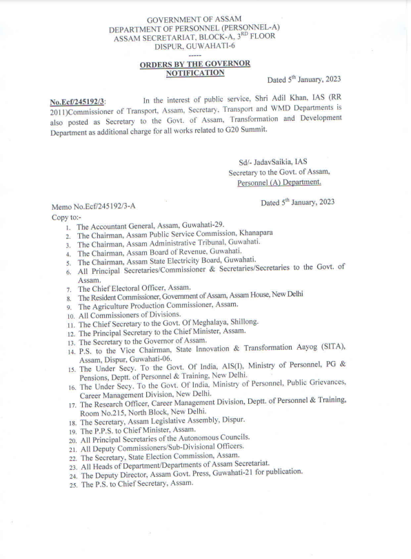 ASSAM IAS OFFICERS TRANSFERRED TODAY : इसके साथ ही आईएएस आदिल खान को परिवहन आयुक्त सहित परिवहन और डब्ल्यूएमडी विभाग के सचिव के रूप में नवीन पदस्थापना सौंपी गई है। इसके साथ ही उन्हें जी-20 समिट से संबंधित कार्य के लिए अतिरिक्त प्रभार सौंपा गया है।
