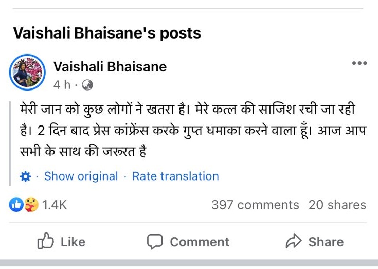 वैशाली माडे ने अपने फेसबुक अकाउंट पर पोस्ट शेयर कर अपनी जान का खतरा बचा है। हालांकि जिस अकाउंट से उन्होंने ये पोस्ट शेयर किया है वह वेरिफाइड अकाउंट नहीं है। लेकिन उनके इस पेज को उनका ऑफिशियल पेज बताया जा रहा है। इस पेज पर उन्हें 149K लोग फॉलो करते हैं।