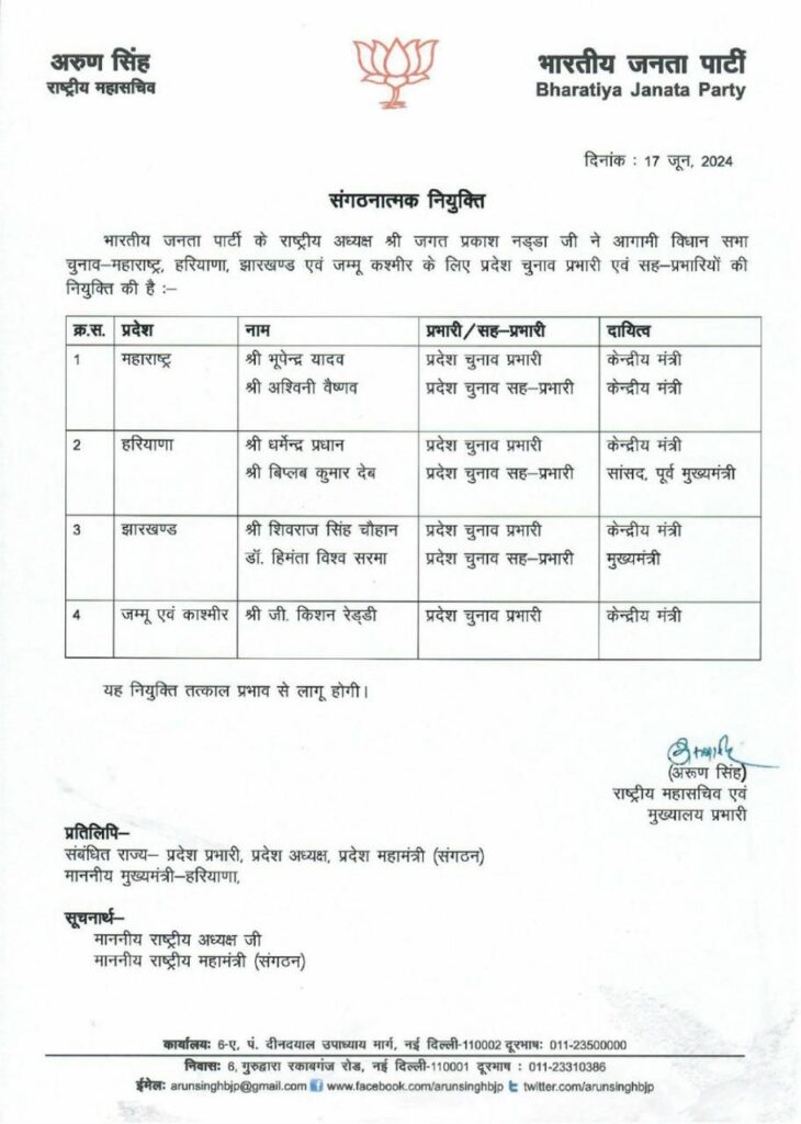 पार्टी की ओर से जारी एक विज्ञप्ति के मुताबिक, केंद्रीय मंत्री भूपेंद्र यादव को महाराष्ट्र, धर्मेंद्र प्रधान को हरियाणा, शिवराज सिंह चौहान को झारखंड और जी किशन रेड्डी को जम्मू एवं कश्मीर का चुनाव प्रभारी नियुक्त किया गया है।