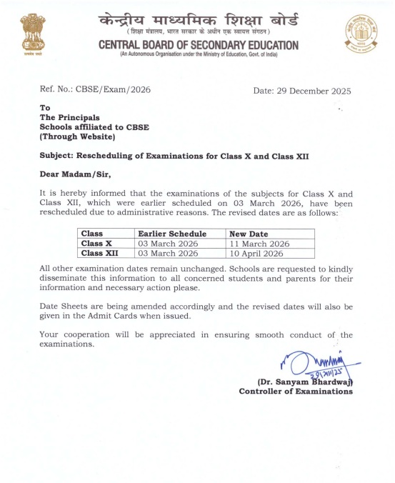 CBSE Board Exam New Date Sheet बोर्ड ने स्पष्ट किया है कि इस संशोधन के अलावा बाकी सभी विषयों की परीक्षाएं पूर्व घोषित कार्यक्रम के अनुसार ही आयोजित की जाएंगी। स्कूलों को निर्देश दिए गए हैं कि वे यह जानकारी छात्रों और अभिभावकों तक समय पर पहुंचाएं, ताकि किसी तरह की भ्रम की स्थिति न बने। हालांकि सीबीएसई ने नोटिफिकेशन में तारीख बदलने की स्पष्ट वजह नहीं बताई है, लेकिन माना जा रहा है कि यह फैसला प्रशासनिक कारणों को ध्यान में रखते हुए लिया गया है।