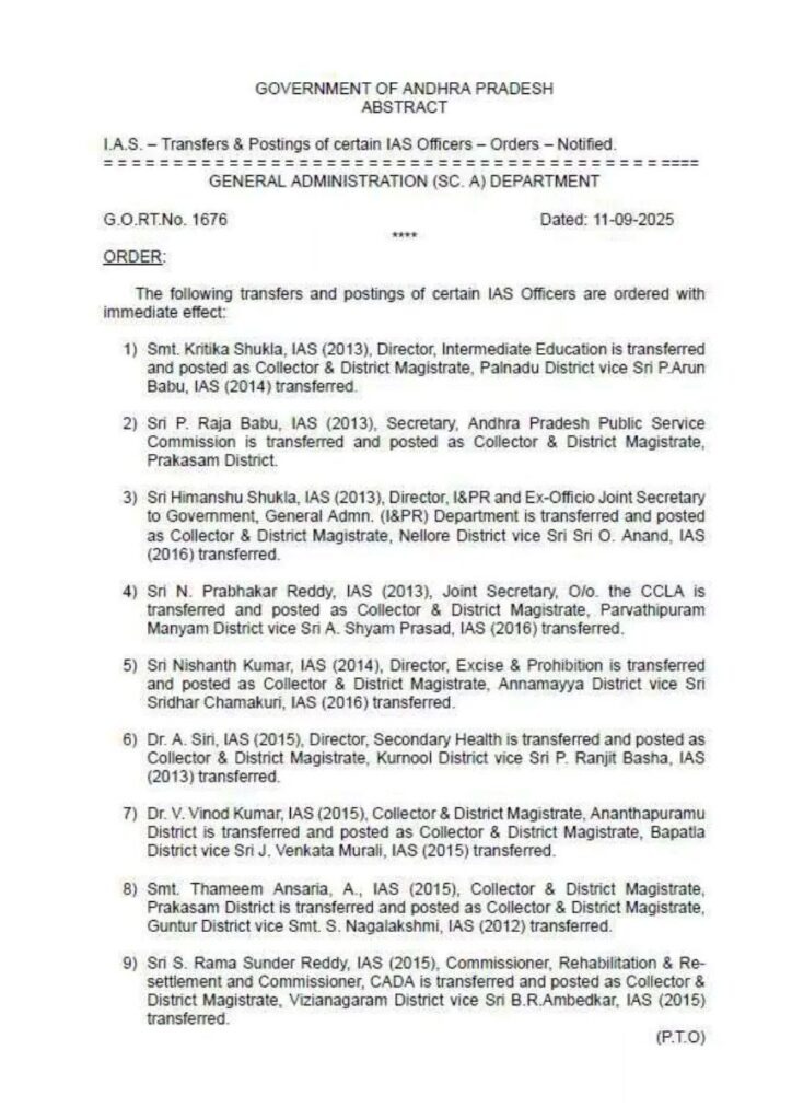 अमरावतीः IAS Transfer Latest News: आंध्रप्रदेश में एक बार फिर बड़ा प्रशासनिक फेरबदल हुआ है। यहां एक साथ 11 आईएएस अधिकारियों का तबादला (IAS Transfer) किया गया है। इनमें कई जिलों के कलेक्टर भी शामिल है। इस तबादले के संबंध में सामान्य प्रशासन विभाग ने आदेश जारी कर दिया है।