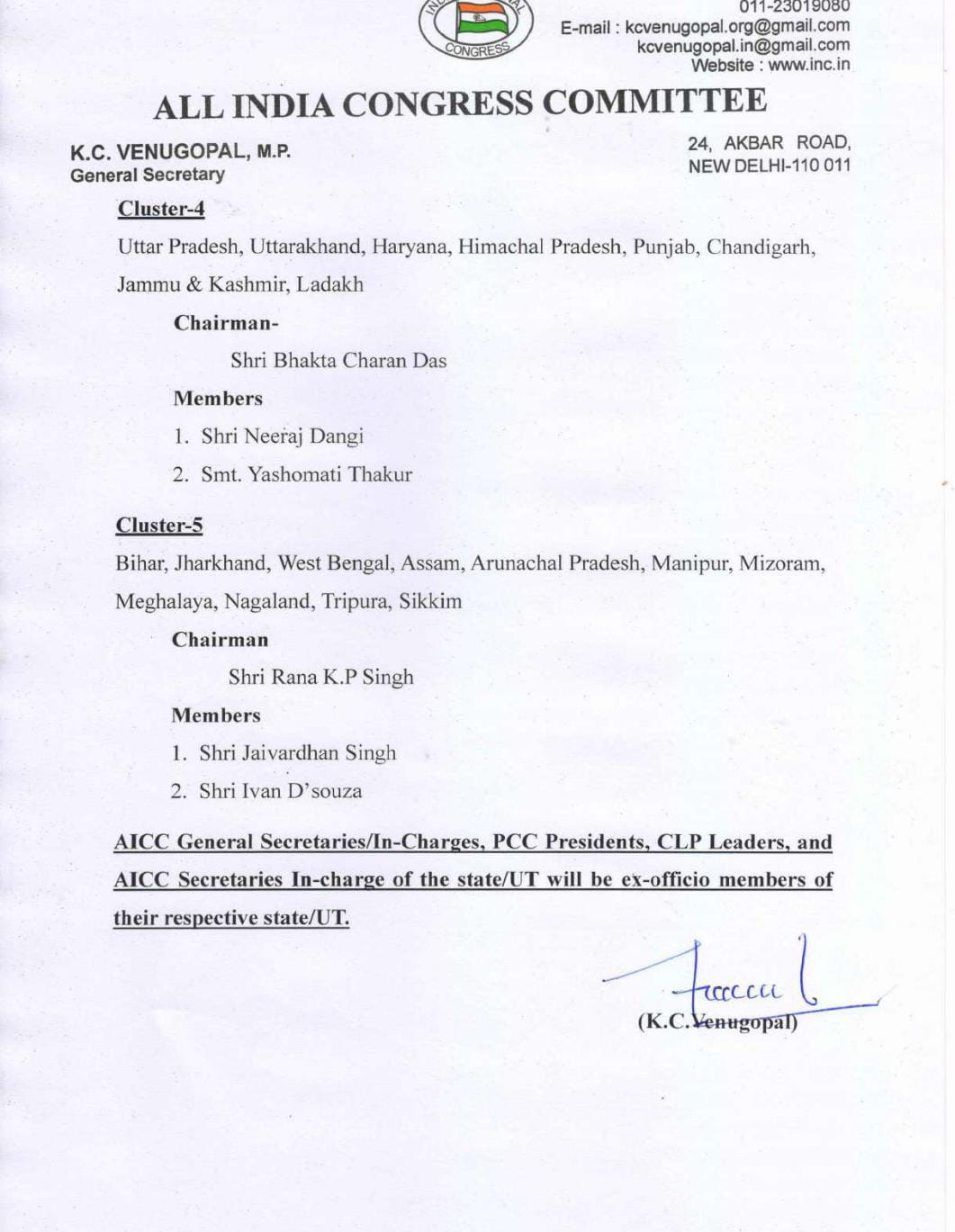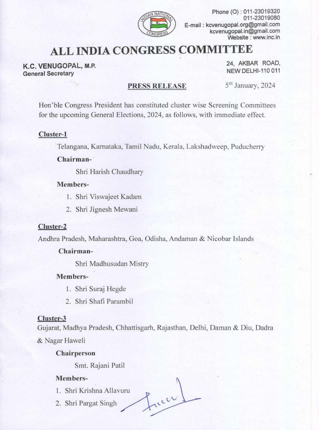 नई दिल्ली : Congress Screening Committee : लोकसभा चुनाव में अब कुछ ही महीने बचे हुए हैं। भाजपा और कांग्रेस दोनों ही पार्टियां लोकसभा चुनाव की तैयारियों में जुट गई हैं। इसी कड़ी में कांग्रेस ने आज लोकसभा चुनाव के लिए स्क्रीनिंग कमिटी का गठन कर दिया है। कांग्रेस ने स्क्रीनिंग कमेंट को 5 क्लस्टर में बांटा है। वहीं हर कलस्टर में एक चेयरपर्सन के साथ दो लोगों को जिम्मेदारी दी गई है।