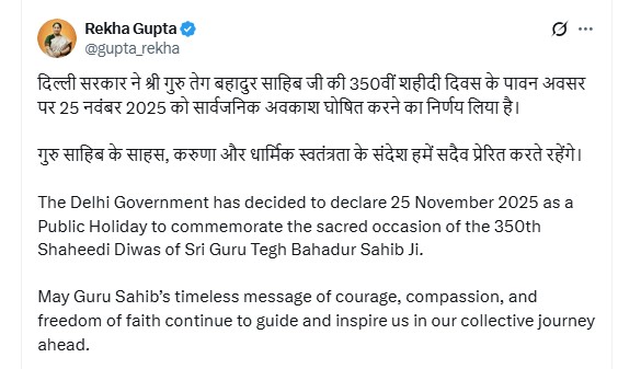 Delhi public holiday: दिल्ली की CM रेखा गुप्ता ने कहा कि श्री गुरु तेग बहादुर साहिब जी के 350वें शहीदी दिवस के पवित्र मौके पर 25 नवंबर 2025 को पब्लिक हॉलिडे घोषित करने का फैसला लिया गया है।