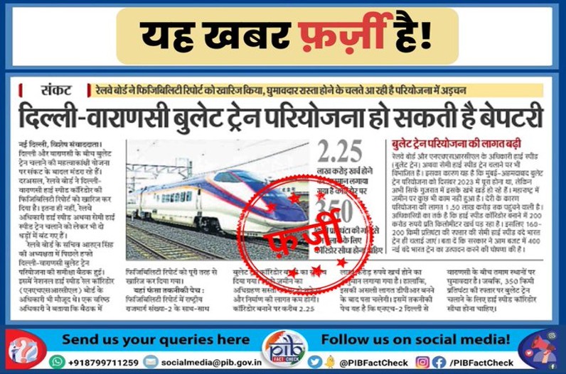 कई मीडिया रिपोर्ट्स में फ़र्ज़ी दावा किया जा रहा है कि रेलवे बोर्ड ने दिल्ली-वाराणसी हाई स्पीड कॉरिडोर की फिजिबिलिटी रिपोर्ट को खारिज कर दिया है#PIBFactCheck