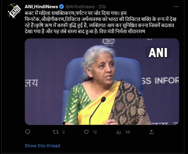 बजट में महिला सशक्तिकरण,पर्यटन पर जोर दिया गया। हम फिनटेक, औद्योगीकरण,डिजिटल अर्थव्यवस्था को भारत की डिजिटल शक्ति के रूप में देख रहे हैं।कृषि ऋण में काफी वृद्धि हुई है, व्यक्तिगत आय कर सुनिश्चित करना जिसमें बदलाव देखा गया है और यह लंबे समय बाद हुआ है: वित्त मंत्री निर्मला सीतारमण