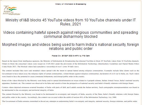 सरकार ने खुफिया सूचनाओं के आधार पर ये बड़ी कार्रवाई की है। सूचना और प्रसारण मंत्रालय ने वीडियो स्ट्रीमिंग प्लेटफॉर्म YouTube को निर्देश दिया कि वह 23 सितंबर को सूचना प्रौद्योगिकी (इंटरमीडियरी गाइडलाइंस और डिजिटल मीडिया आचार संहिता) नियम 2021 के प्रावधानों के तहत उन 45 वीडियो को तुरंत ब्लॉक कर दे।